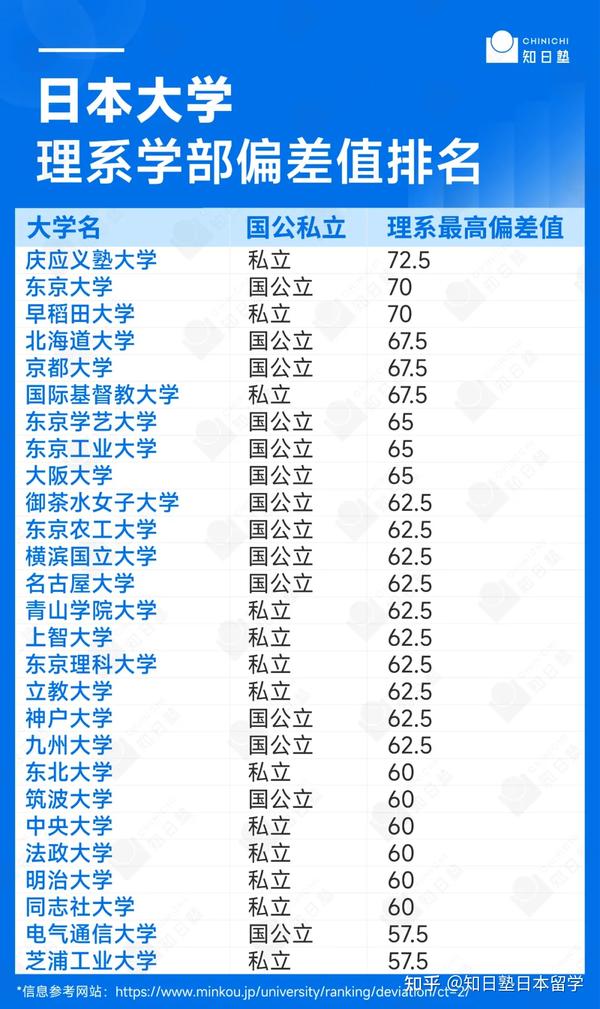 日本的理科院校以其前沿的研究、创新的教学方法和丰富的学术资源,在全球科学界享有盛誉。最后小知老师查询了日本的【理系大学偏差值排名】,为大家推荐一些在日本理科教育领域表现出色的院校,希望能够为各位理科生们提供一些择校和目标制定的参考和启发!