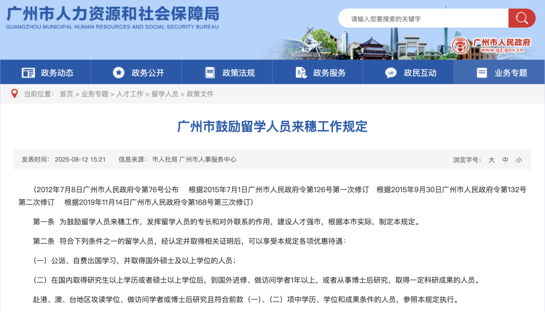 广州对留学生出台专项落户激励政策,为归国留学生开辟“绿色通道”。根据广州市人力资源和社会保障局2025年8月发布的《广州市鼓励留学人员来穗工作规定》,凡取得国外硕士及以上学位的留学生,或国内取得研究生学历/硕士学位后赴国外进修、做访问学者1年以上的人员,经认定后均可享受落户优惠;其中全日制本科及以上学历留学生可直接落户,不限名额、全程网办,配偶及未成年子女还可同步办理随迁手续。