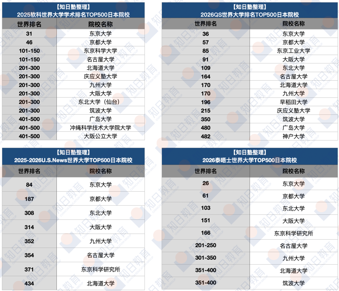日本四大排名Top 500 院校