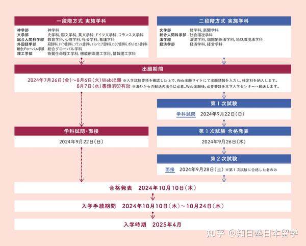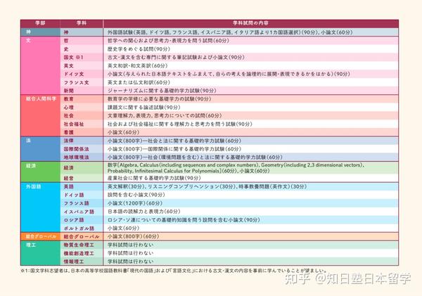 2.哲学科、史学科、国文学科、英文学科、新闻学科、法律学科、国际关系法学科、地球环境法学科:要求EJU日语340分以上、综合科目、数学1或数学2成绩;