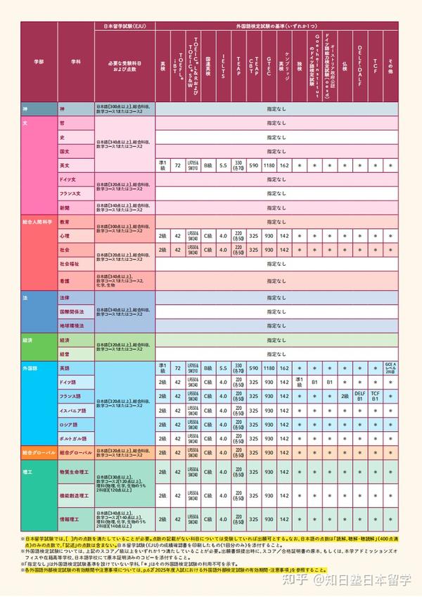 3.德国文学科、法国文学科、社会学科、社会福祉学科、经济学科、经营学科、外国语学部、综合全球化学科:要求EJU日语320分以上、综合科目、数学1或数学2成绩。