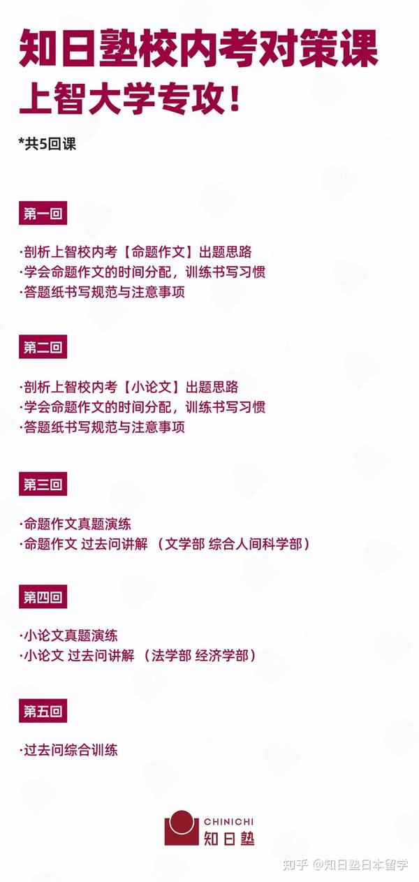 为了帮助同学们能够在校内考中脱颖而出,知日塾推出针对【上智大学】的专项校内考对策课。带你熟练的掌握命题作文及小论文技法,传授校内考秘籍。
