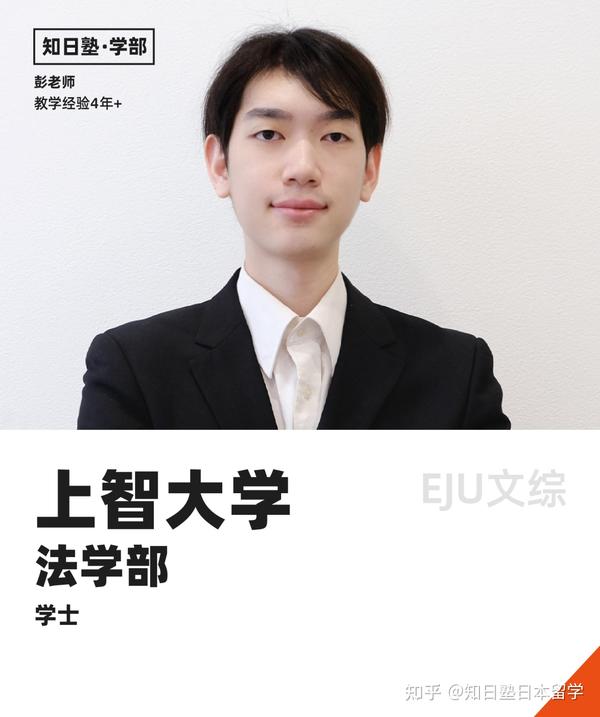 彭老师毕业于上智大学法律研究科,曾在不经由私塾而是单独备考EJU的情况下两度参加EJU文综考试,取得195、196分的好成绩,他深知同学们在学习和准备EJU时的疑虑与困难,从而为同学提供全方面的辅导。彭老师强调以提升人文素养为核心的文科综合学习方法,带领同学借由提升能力来提高分数,敲开理想学校的大门。彭老师注重“知其然,知其所以然”的教学理念,重视学习的不只是知识是什么,还要知道为何如此以及为什么我们要学习这些知识。在知道为什么要学以及如何学的基础之上,更深刻的理解所学习的知识。彭老师认为应该提高同学们的以“基础知识”以及“逻辑性思考与判断能力”为支柱的解题能力,以“基础题不做错”“难题提高正确率”为着眼点的考试思路来应对各类考题。