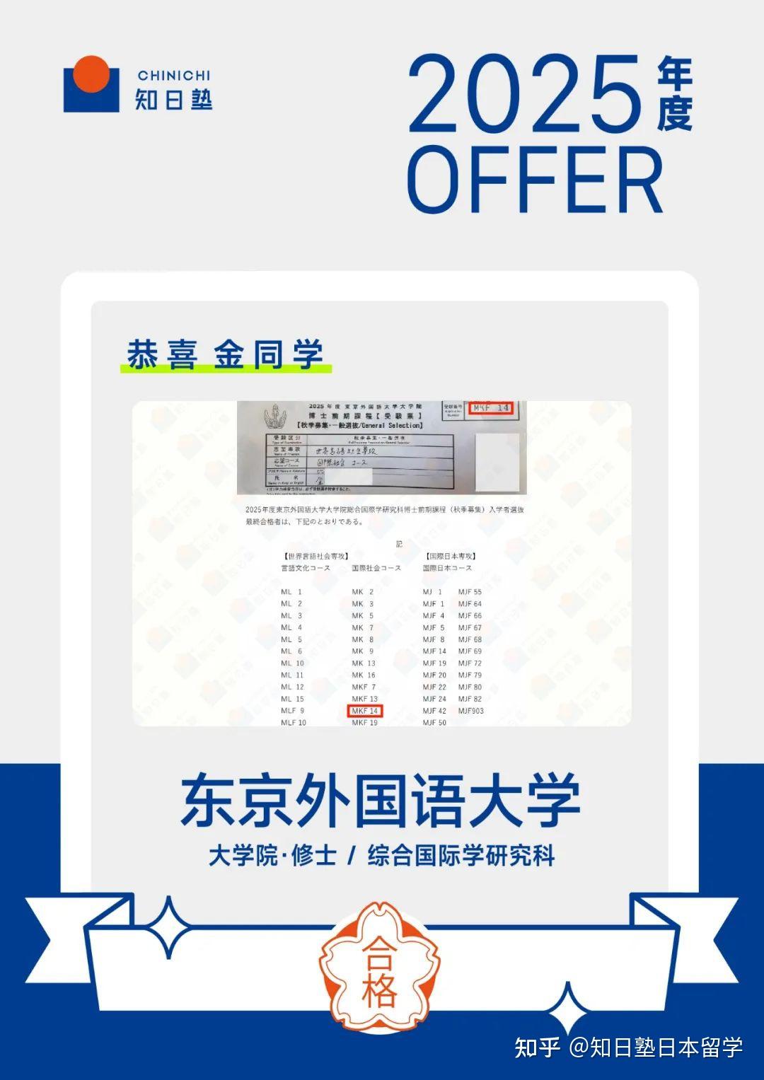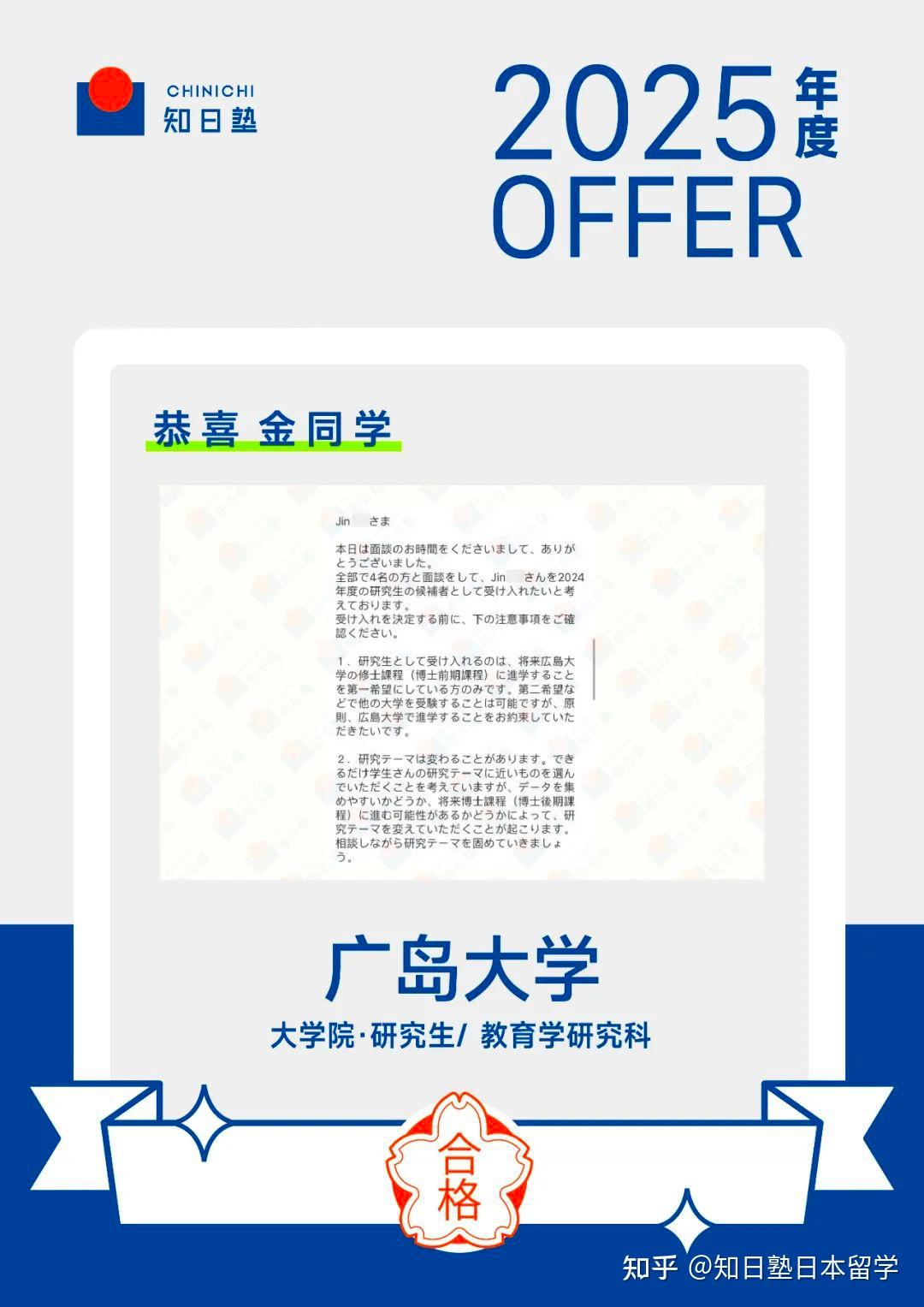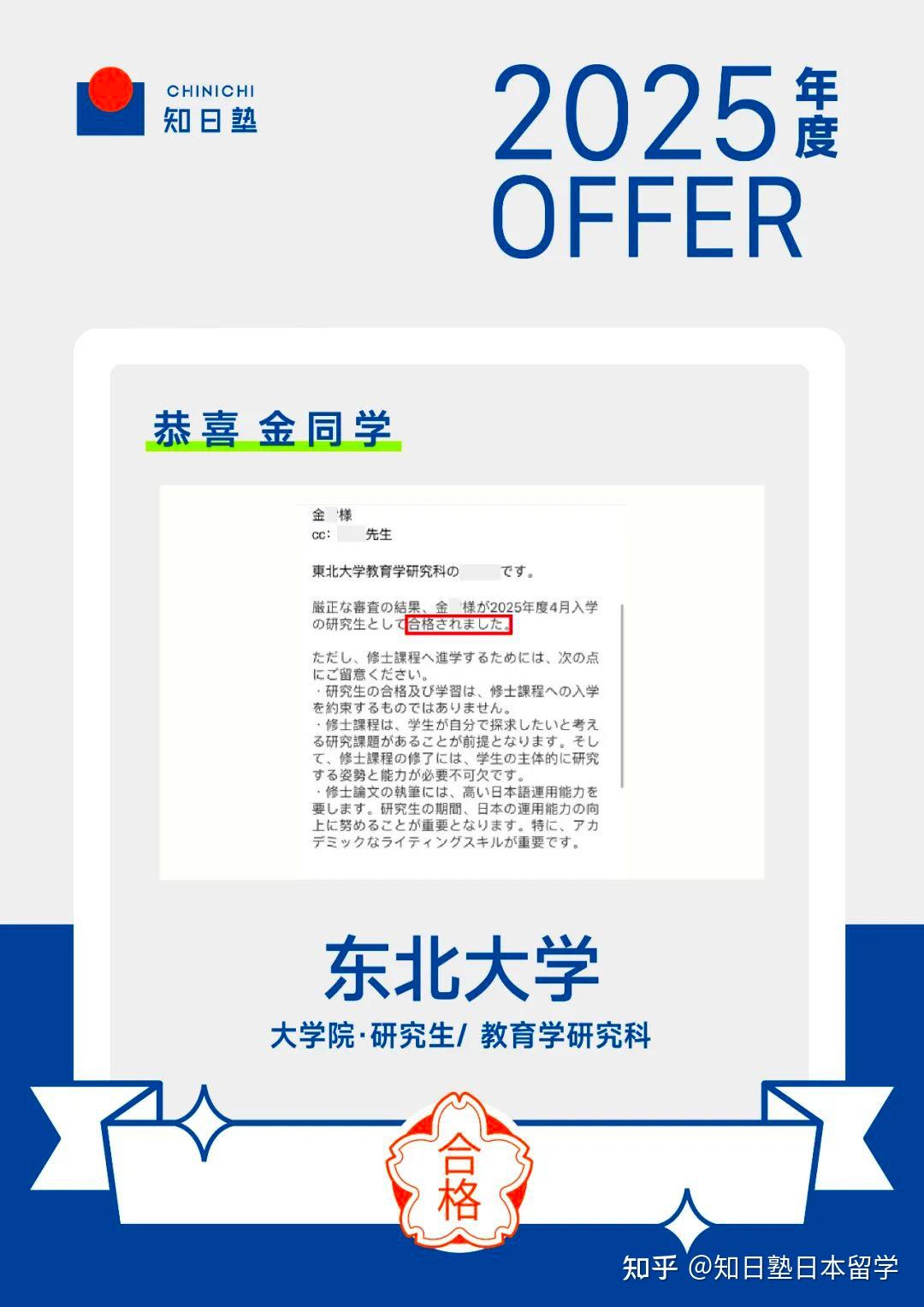 金雷同学从国内网课开始就全勤出席,课上踊跃发表自己的想法,学习态度积极,也考出了日语英语双优的成绩。来日后更是频繁到线下和老师面谈,每次都可以快速完成布置的学习任务,在筛选学校和联络教授上也下了很大的功夫和时间,这才能同时收到好几位教授的回信。到了备考阶段她不仅积极参加线下冲刺zemi,也没有因为自己日语成绩不错就对面试准备有所懈怠,最终在金雷同学的不懈努力下,成功获得了三所学校的合格通知。祝愿她日后的研究之路也能一切顺遂!